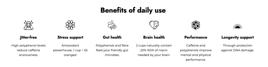 Roasted fresh weekly in London, it might be healthy coffee, but it’s still coffee with the same sensational taste you know and love making it the coffee lover’s healthy swap!
